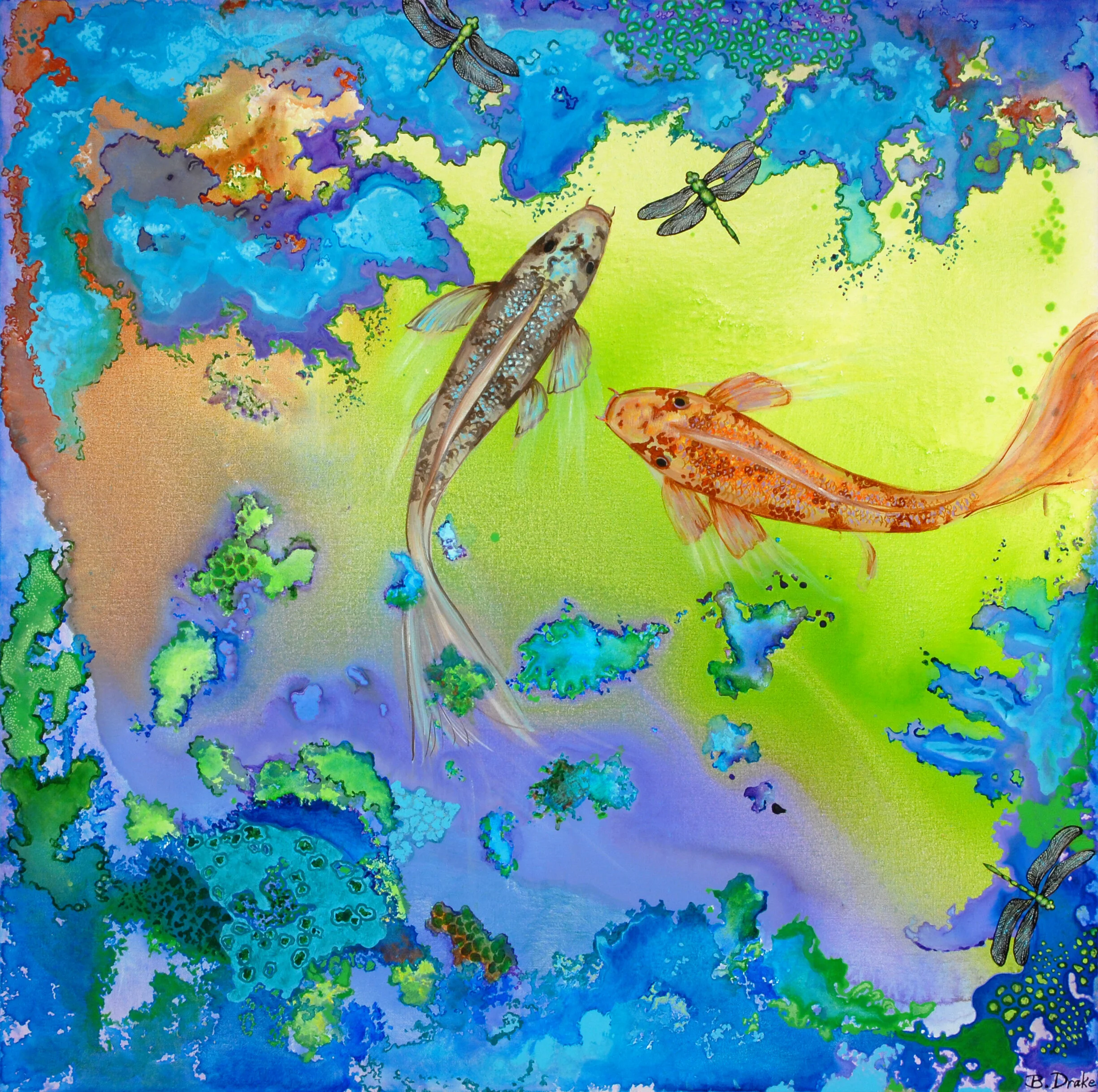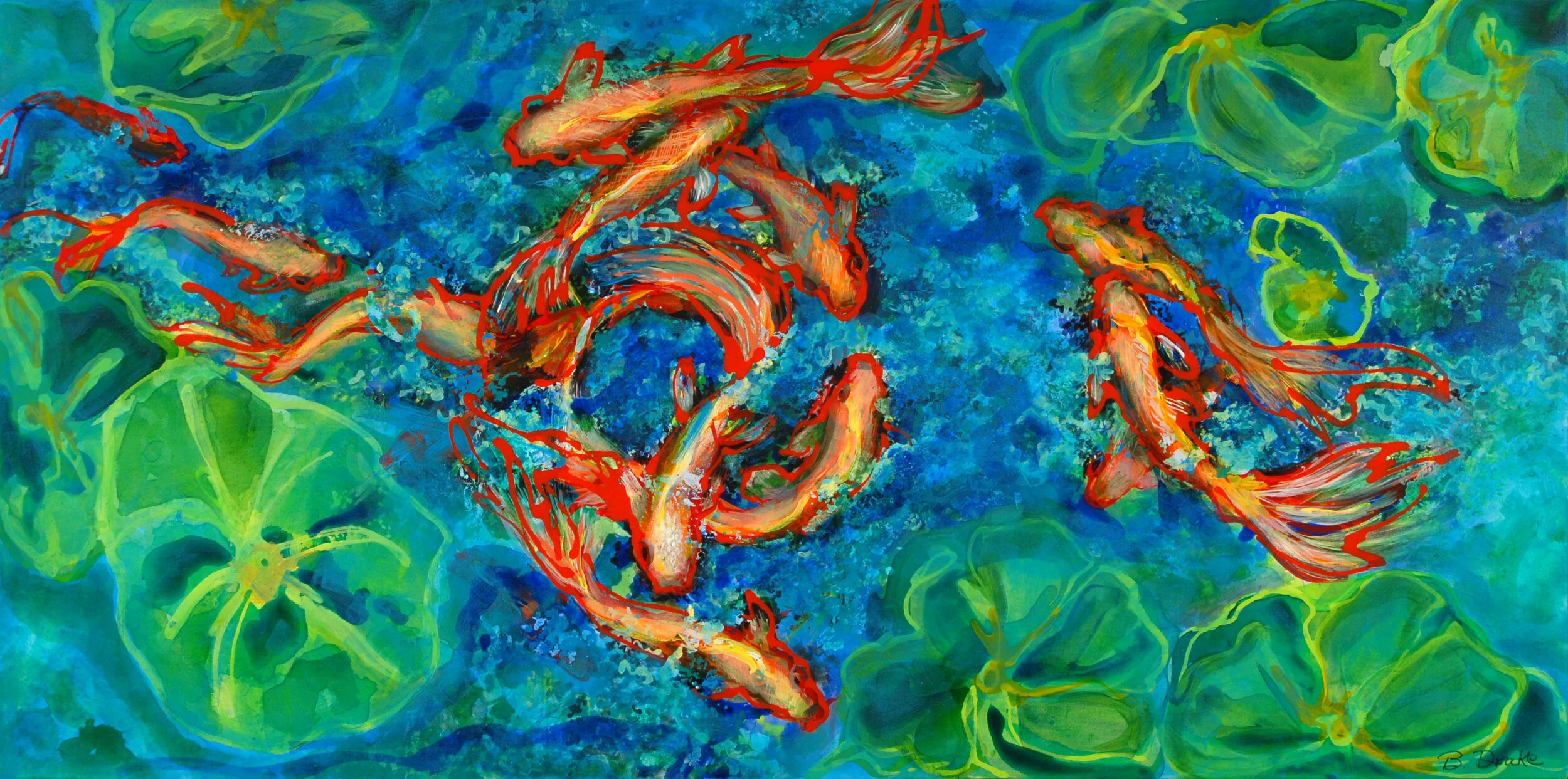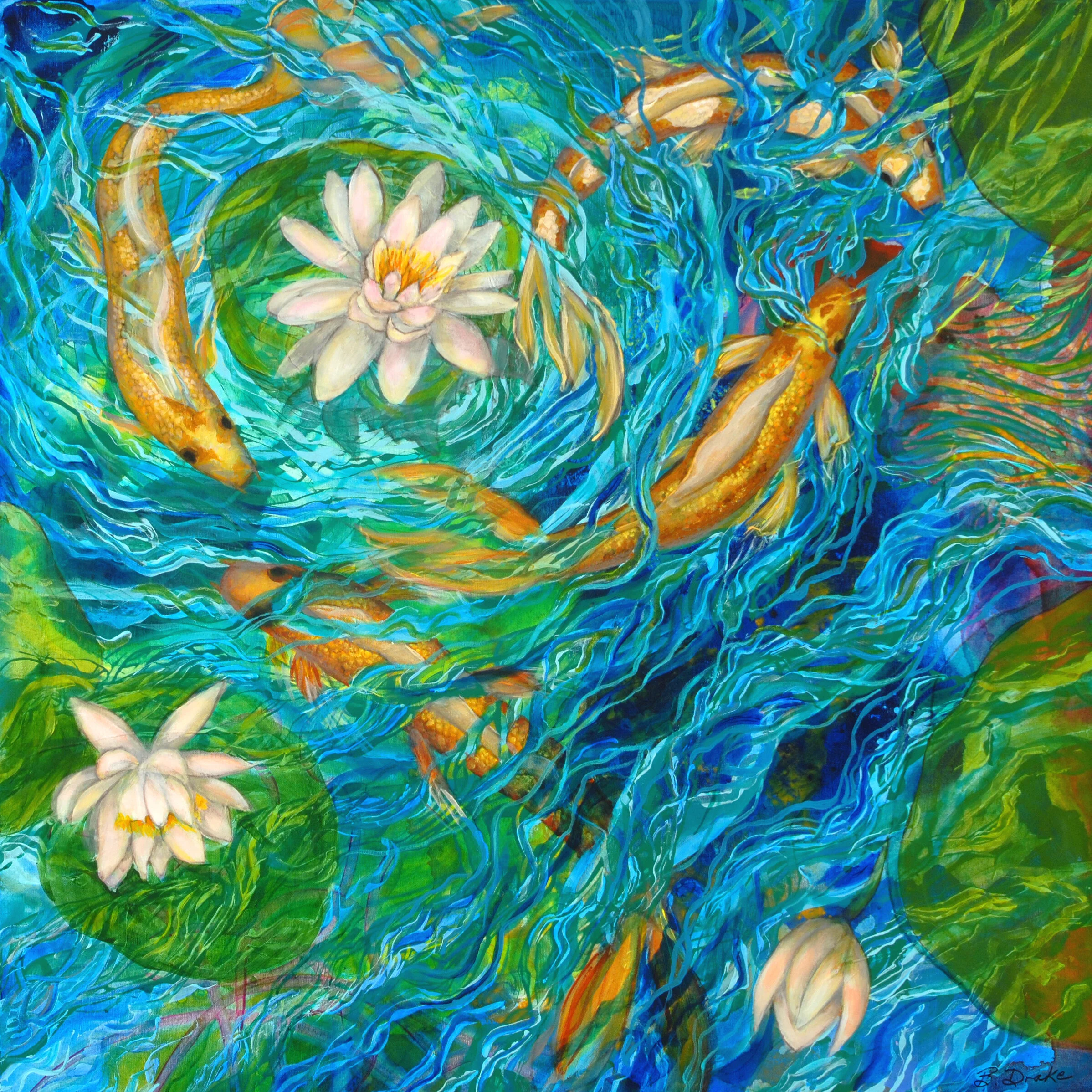Carp Diem is a play on words reflecting the calming and graceful world of Koi ponds. I became entranced with the beauty of the Koi and Carp water gardens I discovered while traveling in The Orient. These water gardens highlight the zen reflection one finds in these magical environments.