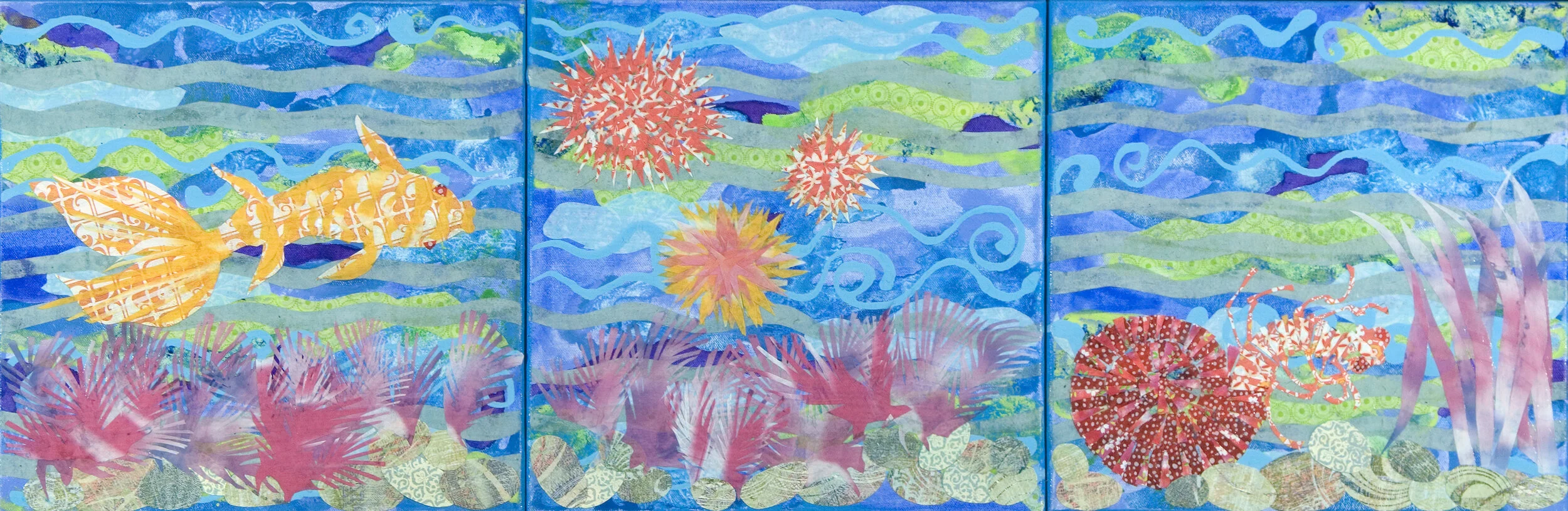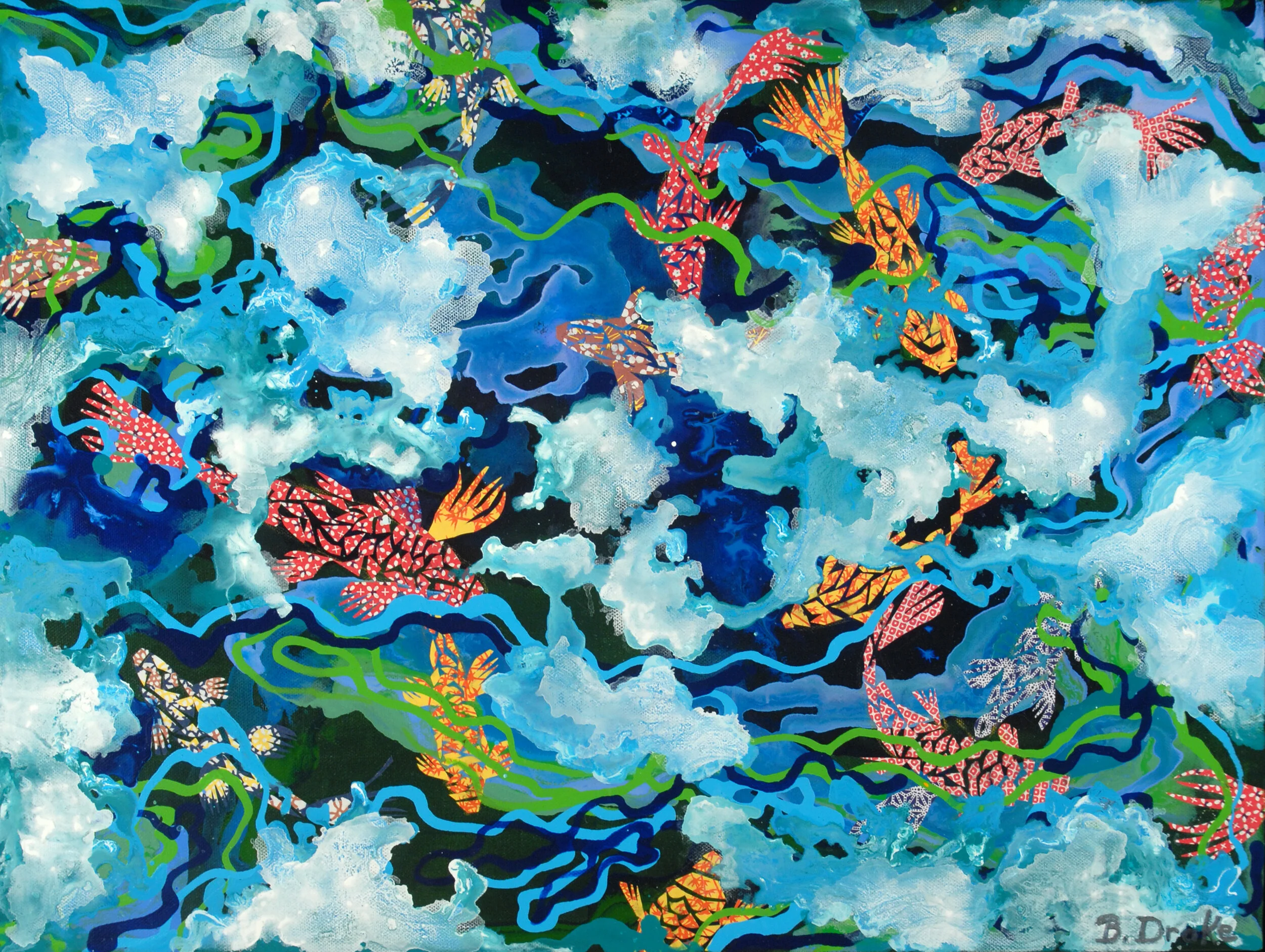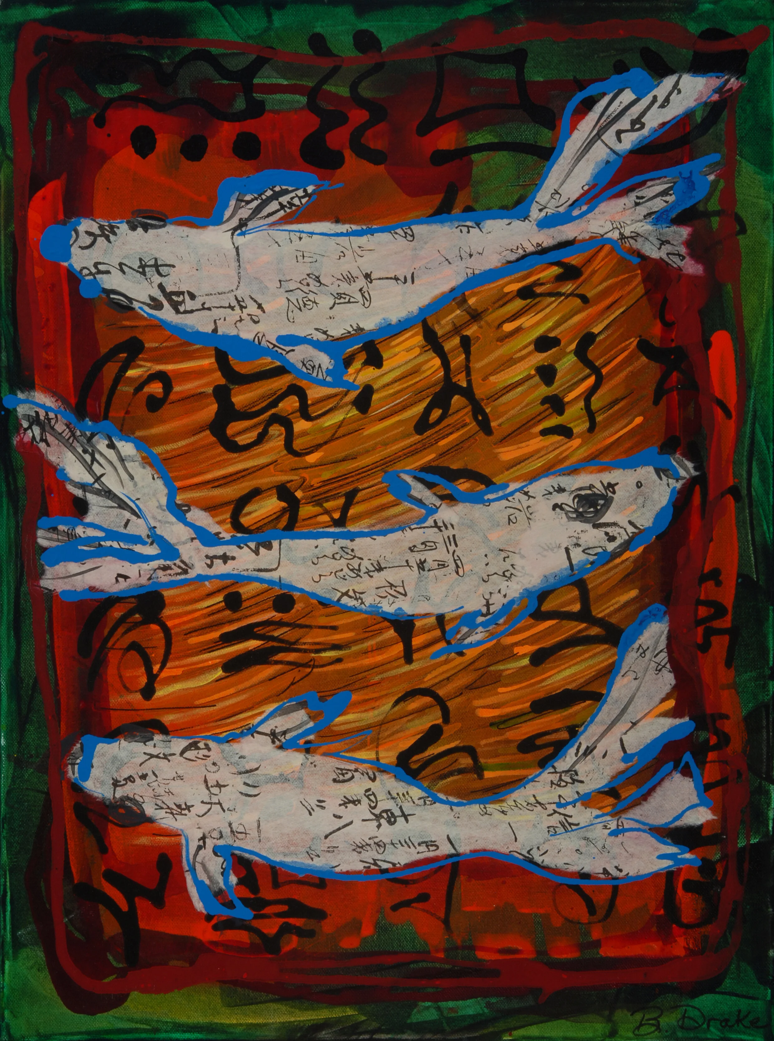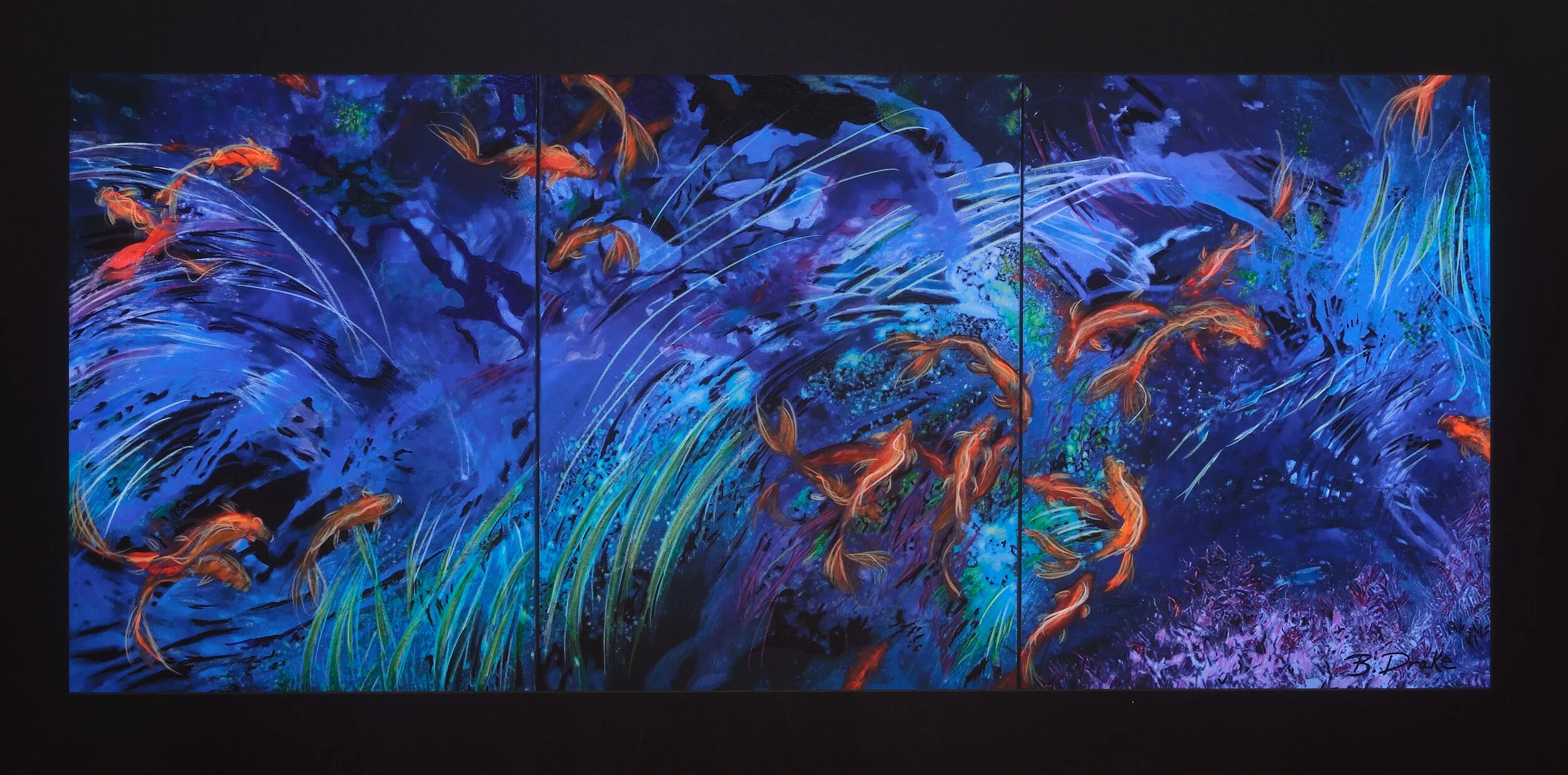 Carp Diem is a play on words reflecting the calming and graceful world of Koi ponds. I became entranced with the beauty of the Koi and Carp water gardens I discovered while traveling in The Orient. These water gardens highlight the zen reflection one finds in these magical environments.